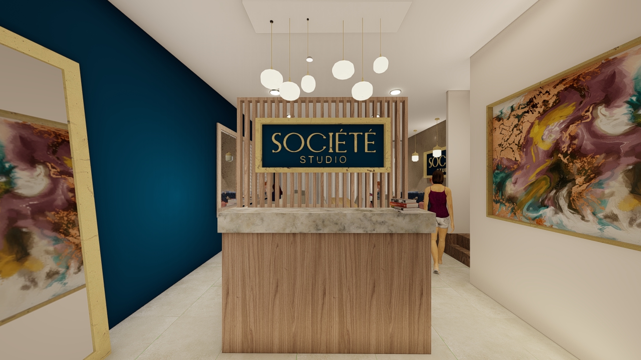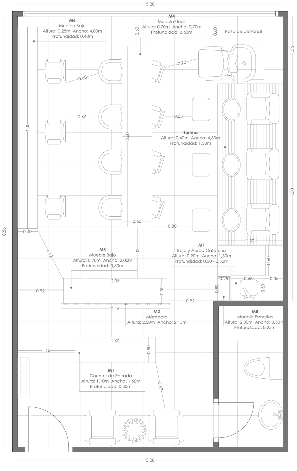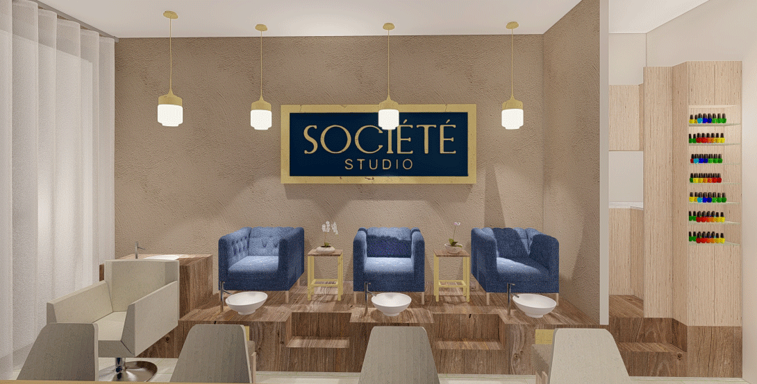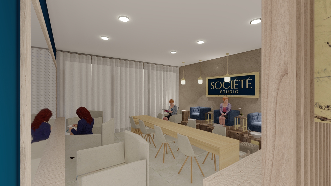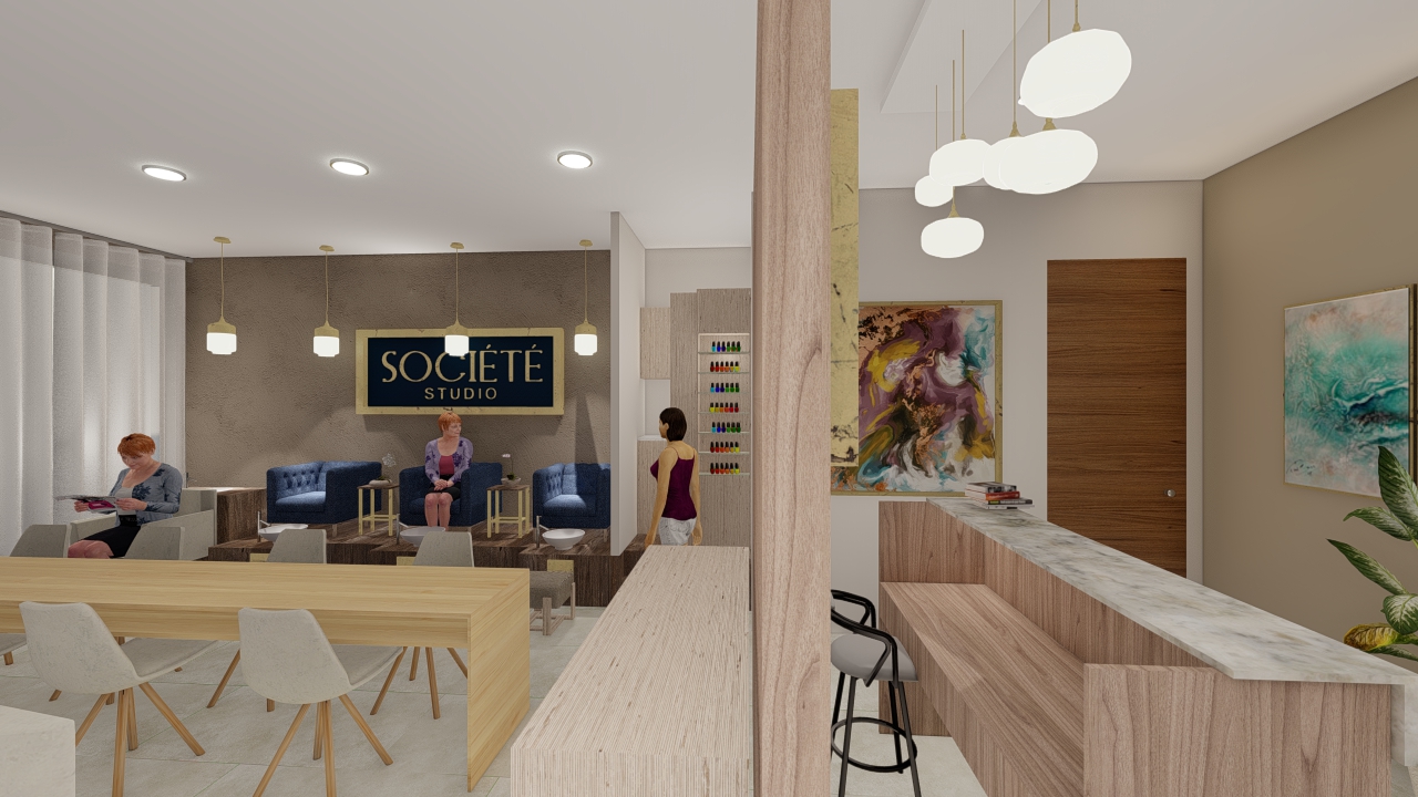Desarrollo de propuesta de interior comercial, para salón de belleza y uñas.Como elemento principal se utilizan materiales que simulan la madera: gres porcelánico maderado, aglomerados con acabado de madera, combinados con el color azul de la marca...